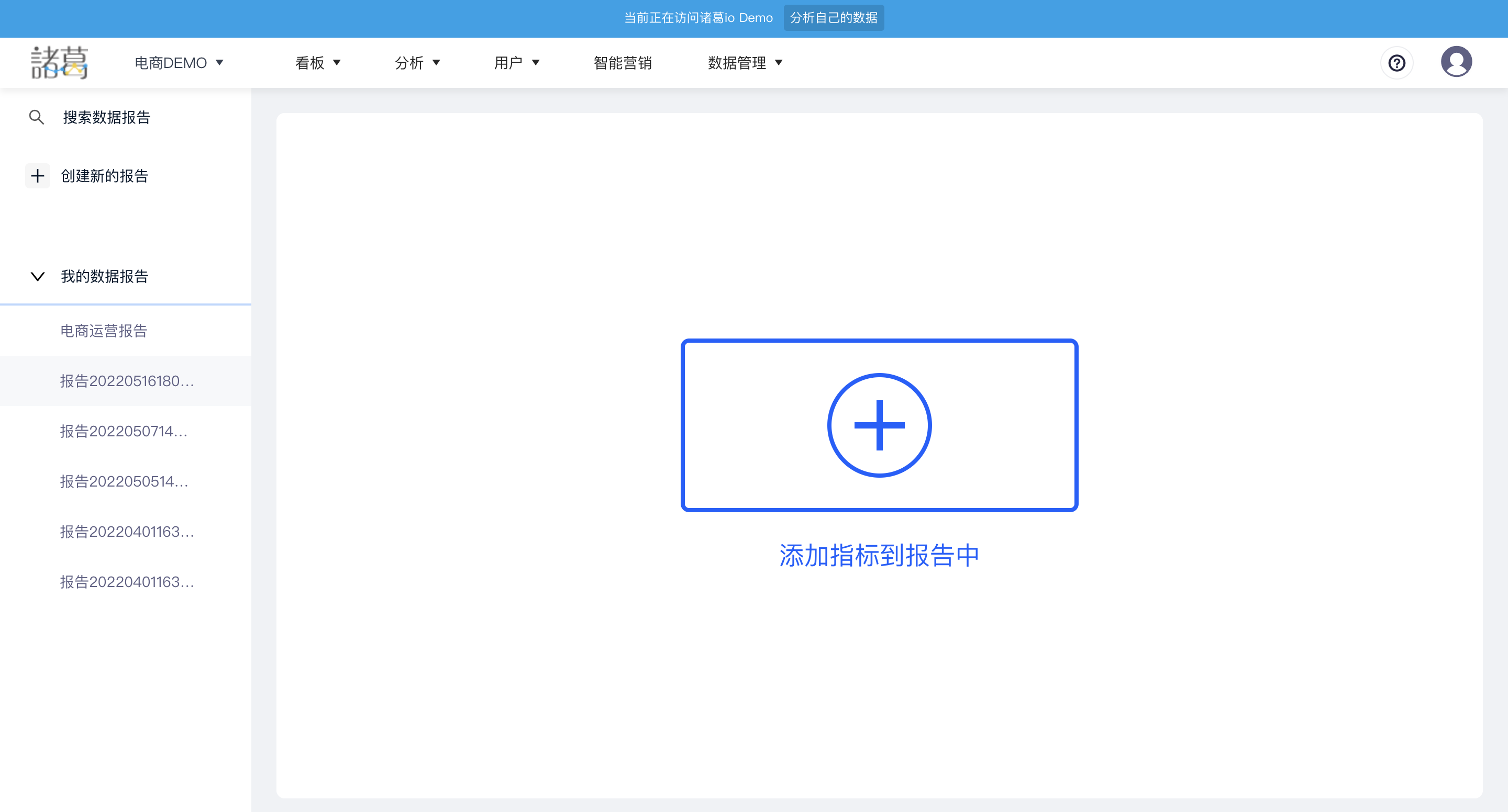 您可以点击导航栏看板->数据报告,进入数据报告功能;进入功能后点击左侧列表中的「创建数据报告」,开始编辑您的报告创建旅程