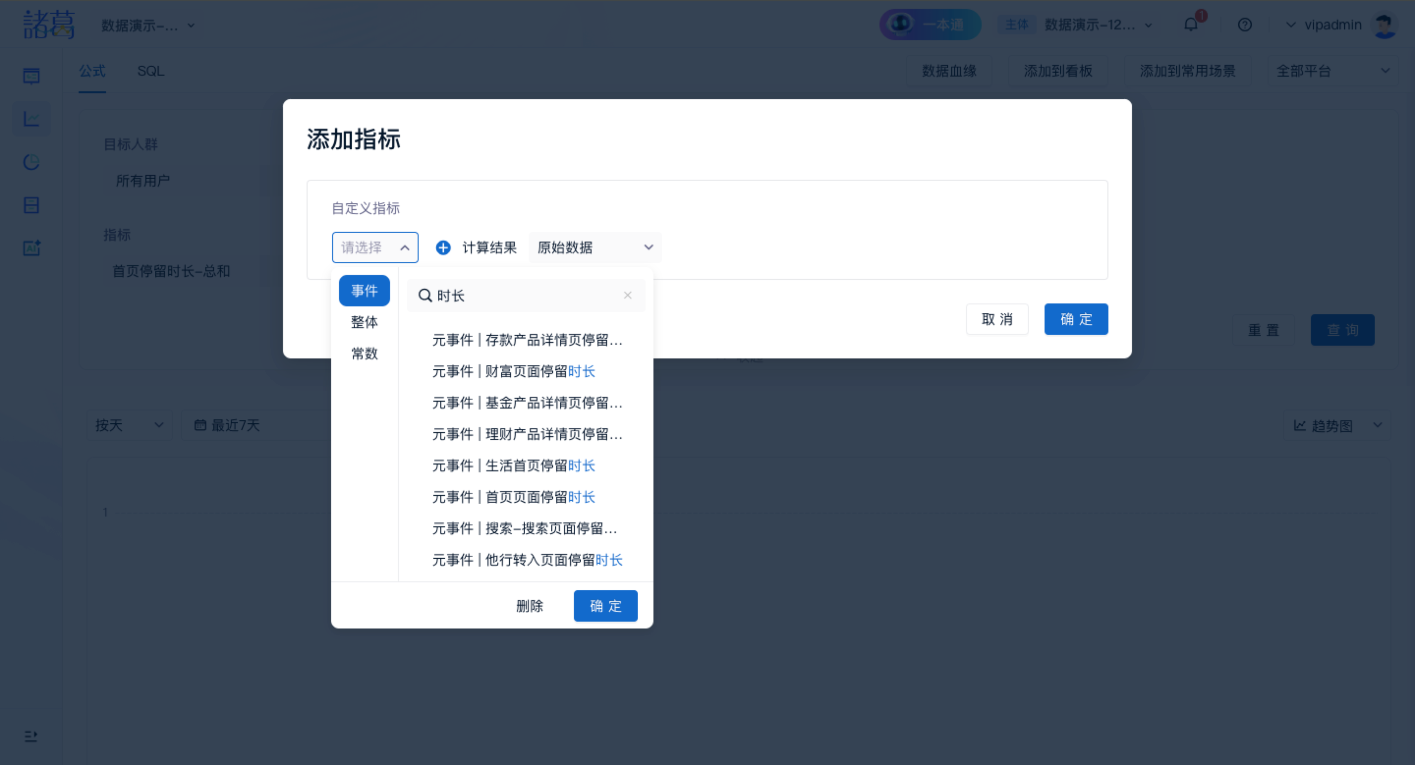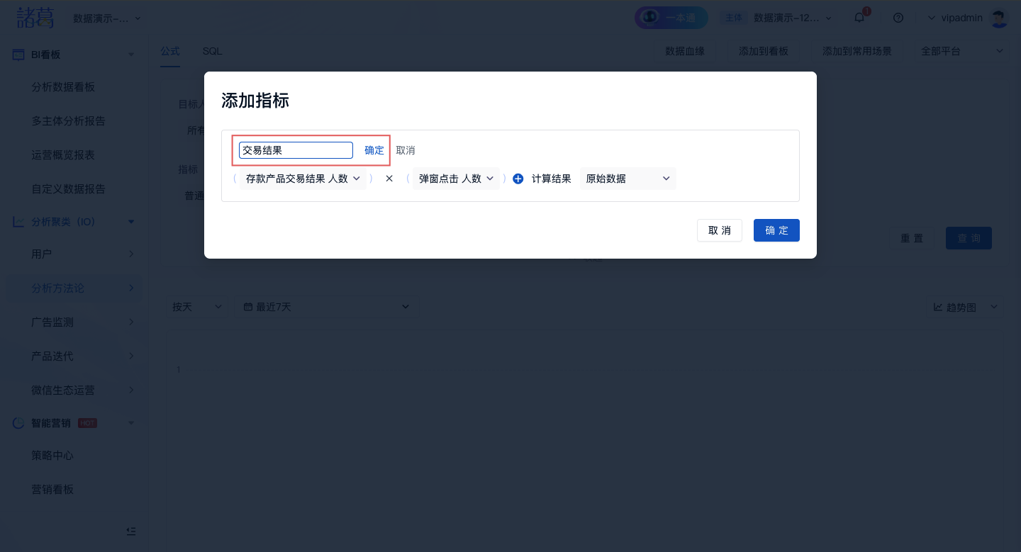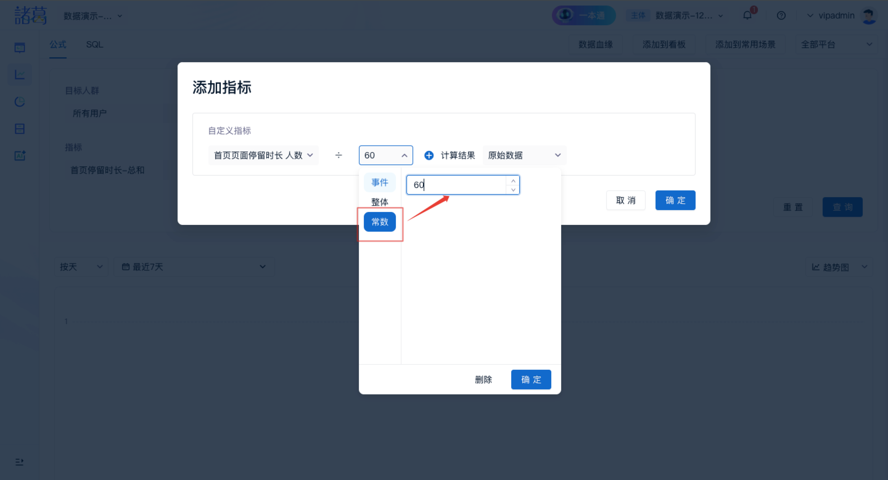 step1:为公式项插入指标;公式项中可插入:事件指标、整体指标、常数指标;
