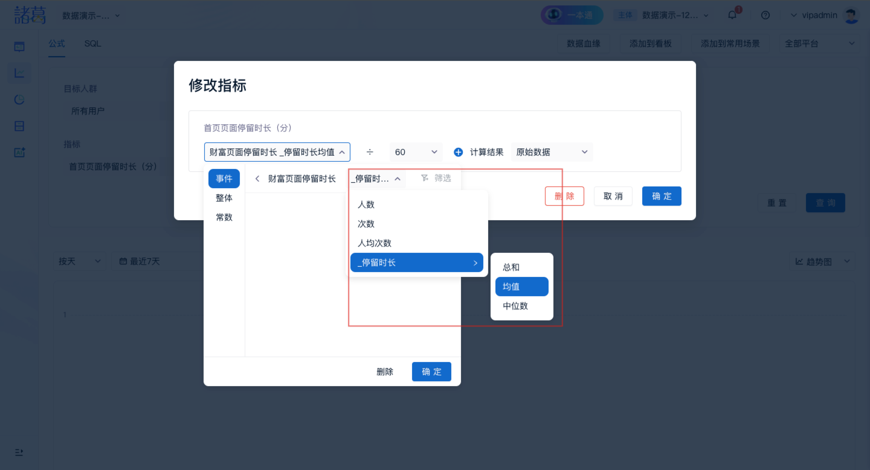 - 2:事件「首页页面停留时长」统计指标选择为「停留时长-均值」