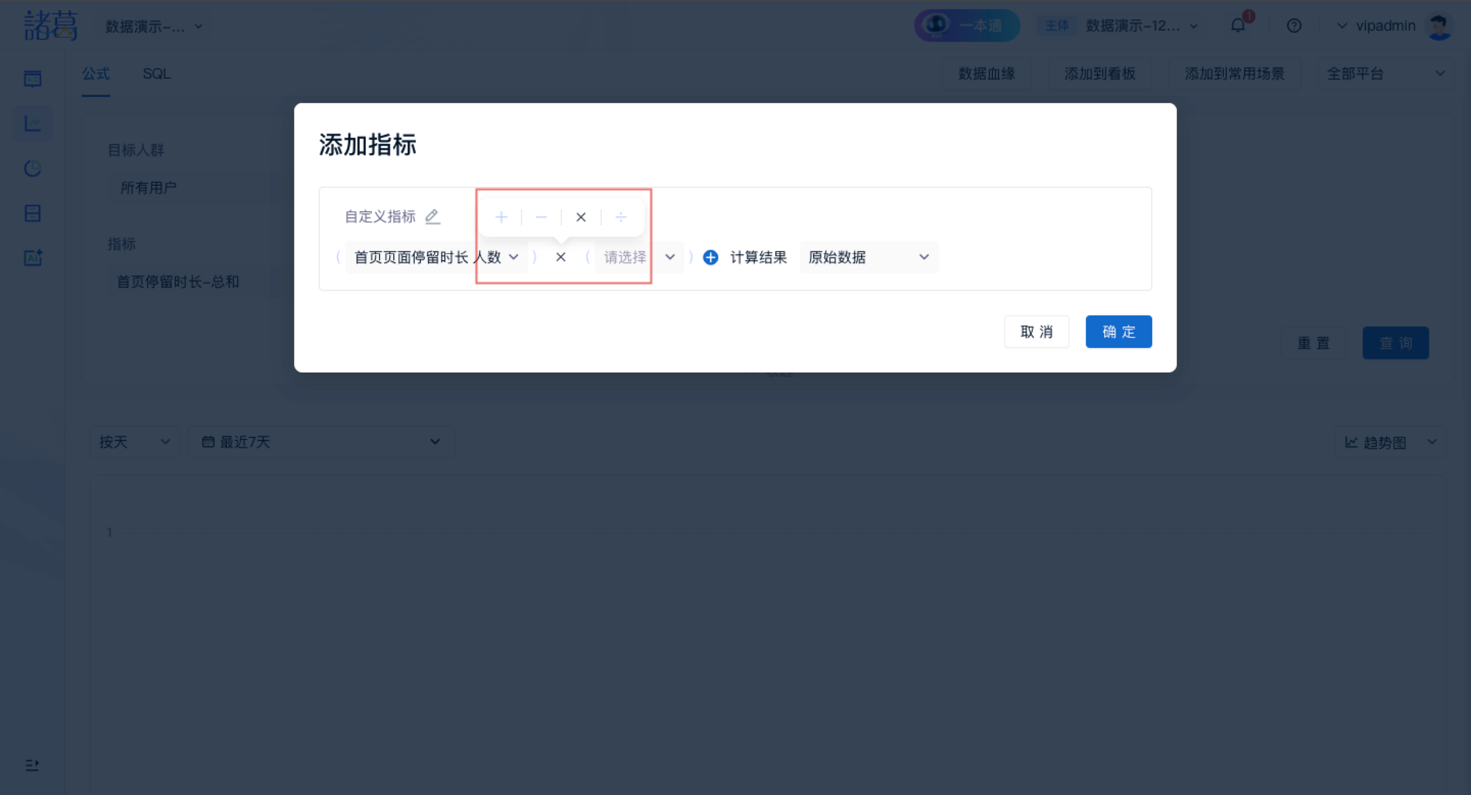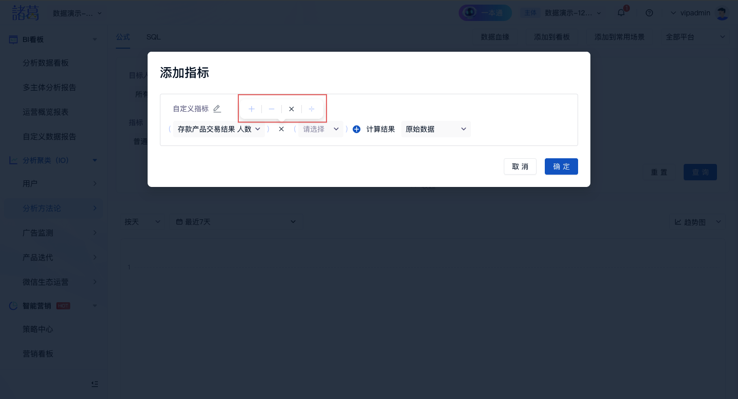 step4:选择「添加指标运算」,可选择「+」「-」「*」「/」四则运算,可对其他指标或常数进行四则运算