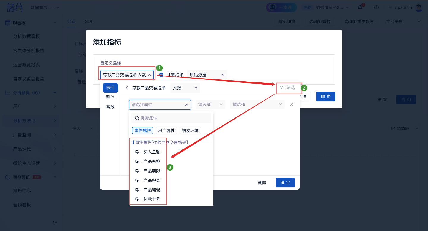 - 第二项选择事件「付款成功」的次数;属性筛选「会员等级」是「钻石会员」