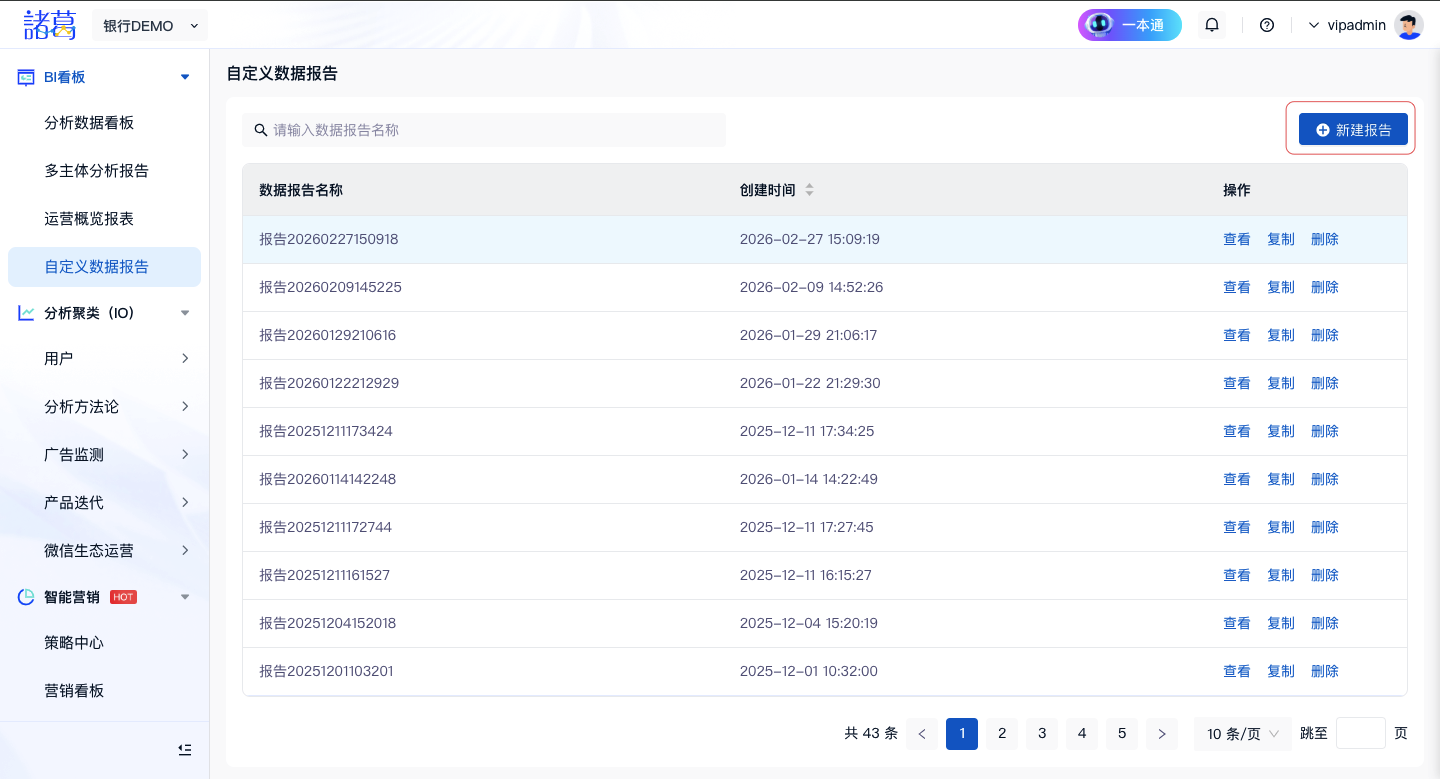 您可以点击左侧导航栏:BI看板->自定义数据报告,进入数据报告功能;进入功能后点击功能右上角的「新建报告」,开始编辑您的报告创建旅程