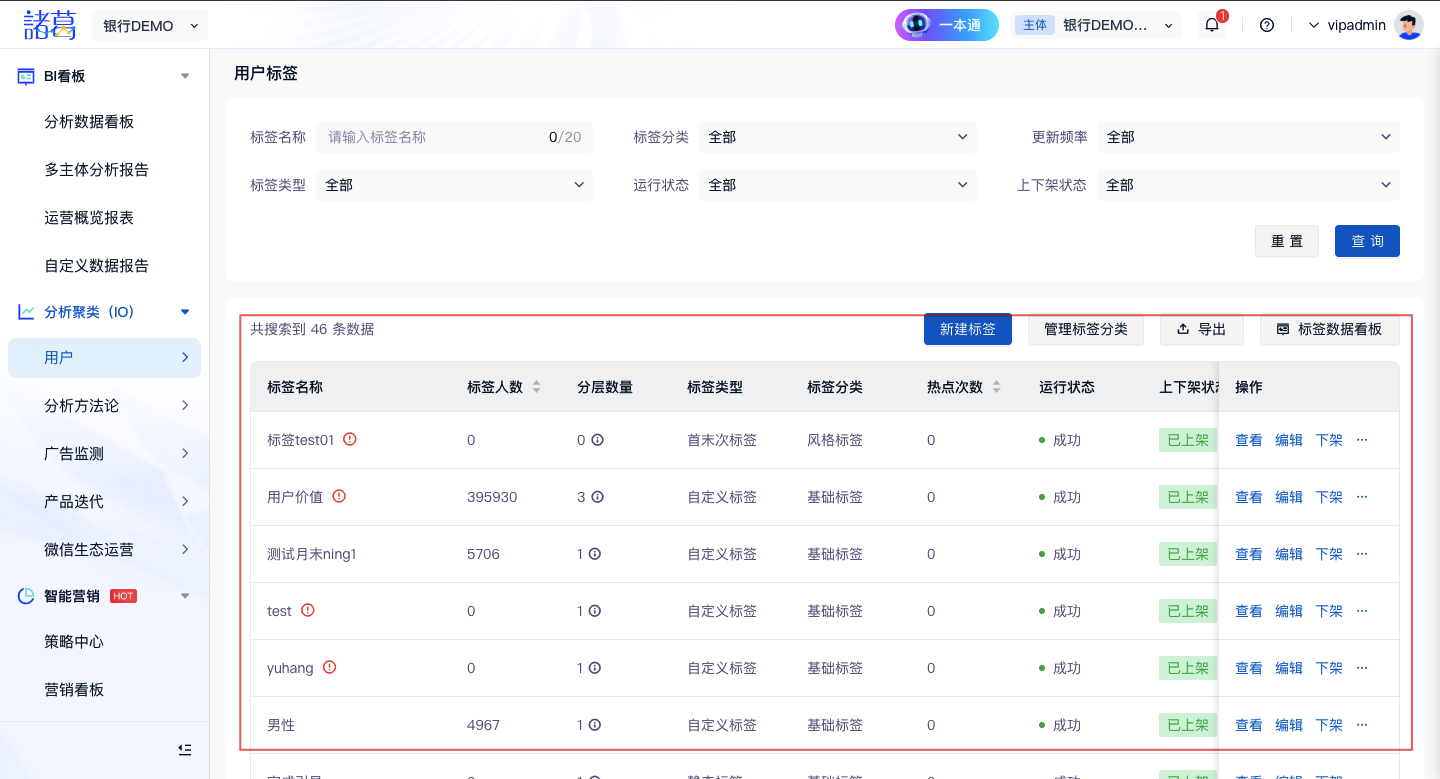 - 下架标签后,对于新创建的分群、营销画布、看板指标、分析模型、用户画像、文章/视频、群发消息等功能无法选择已下架的标签;
