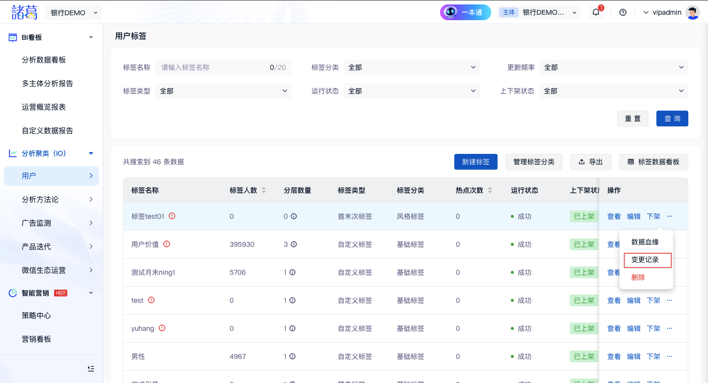 支持通过列表、查看、筛选、管理标签任务的运行状态,并提供上架/下架、更新、数据血缘、变更记录等管理操作,实现对标签任务的精细化管控,显著提升标签管理效率与响应速度。