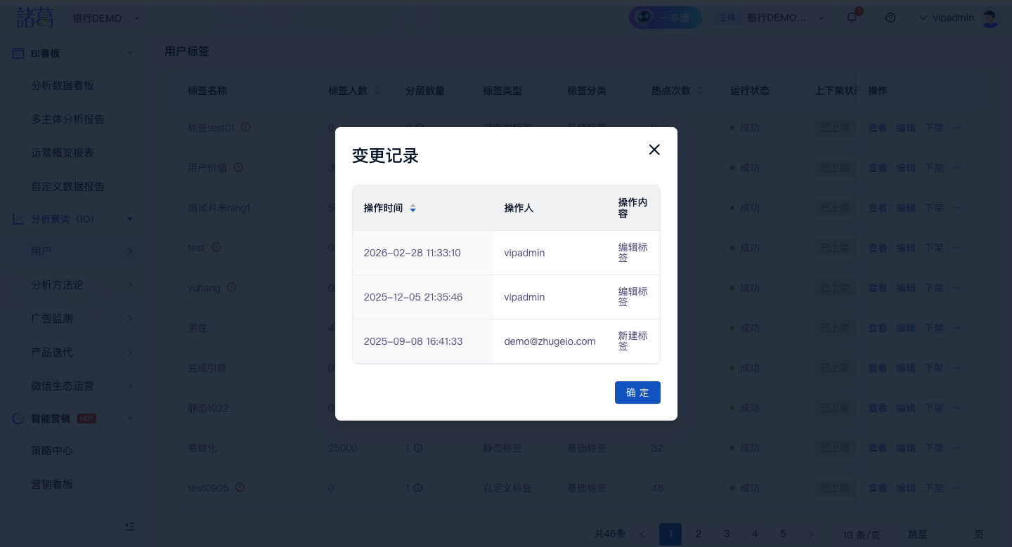 标签列表点击“变更记录”按钮,支持可以查看标签生命周期内的操作记录,以便回溯标签变更情况。