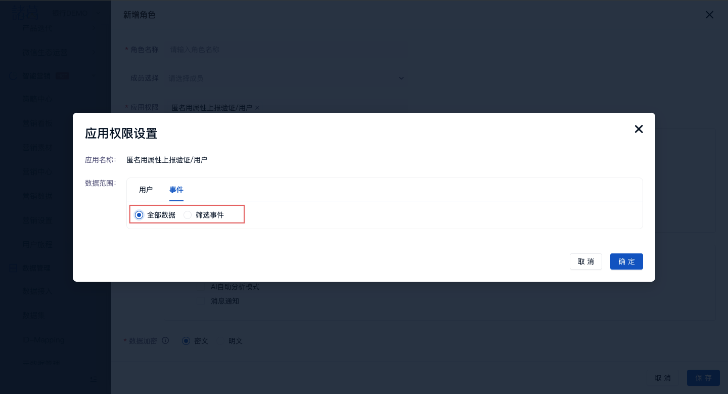 (3)可通过筛选用户或筛选事件对用户可见数据范围进行设置
