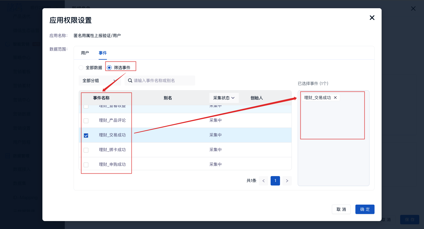 - 通过“筛选事件”进行数据范围筛选,设置该角色可以看到哪些符合条件的用户数据,例如:仅支持查看已完成“理财_交易成功”用户,您可以根据事件属性选择该条件,如下图: