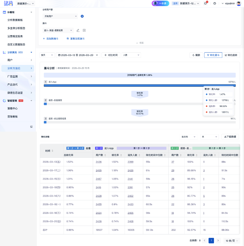 您还可以将用户的行为序列(如『进入APP→发起搜索→点击搜素结果』)定义成漏斗,分析转化率: