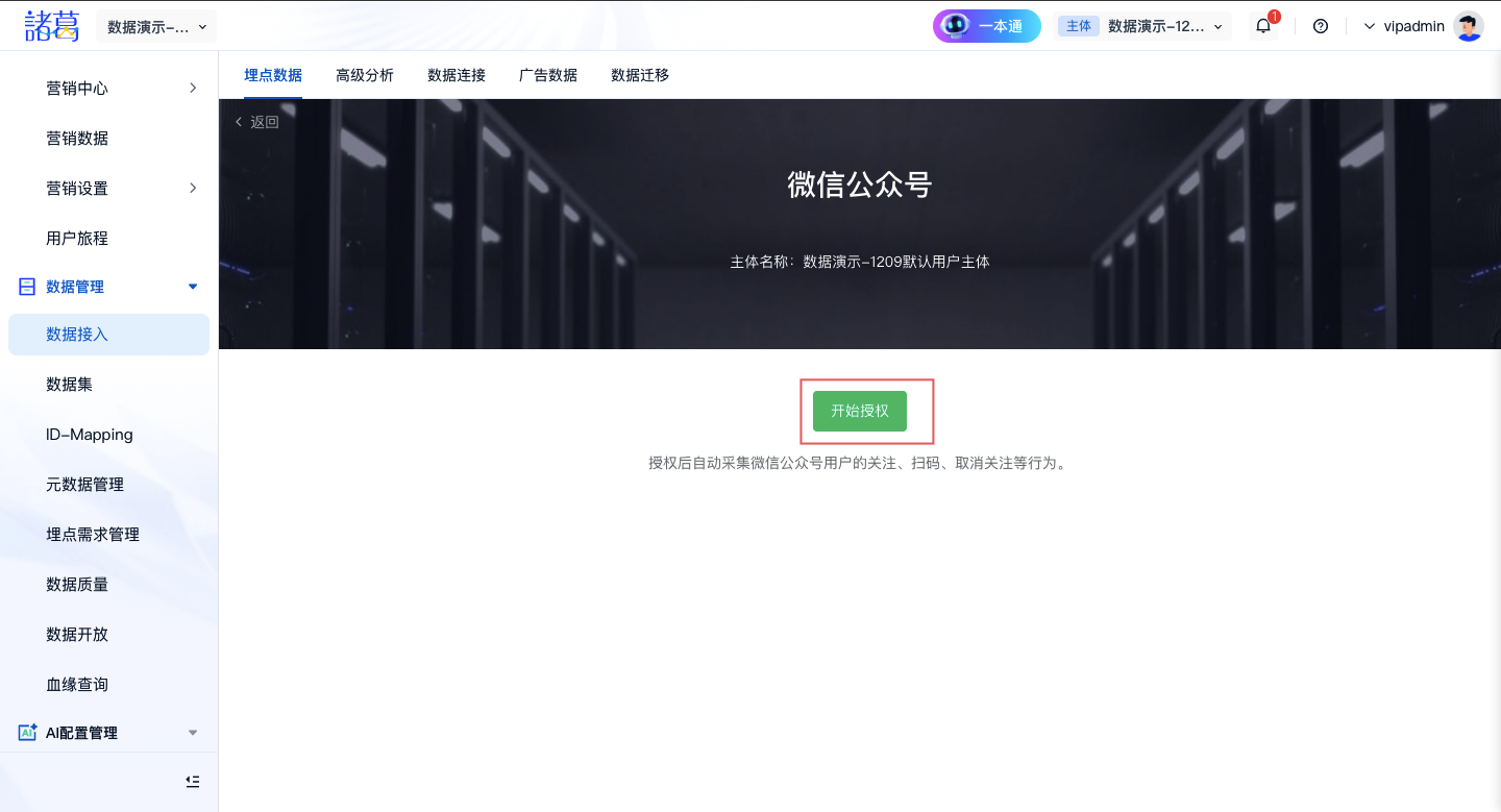 接入微信公众号需要「微信授权」,授权后自动采集微信公众号用户的关注、扫码、菜单访问、取消关注等行为。